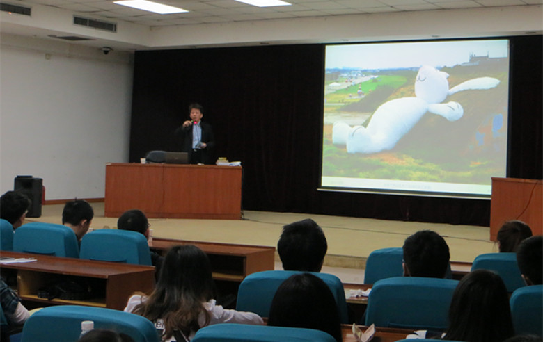 讲座以提问并派送礼物开始,从模仿≠创意、创意方法、创意环境、创意空间设计等方面展开,陈博士结合个人获奖设计作品的构思历程、他和他的员工参加社会爱心设计实践活动的具体案例,以大量照片和视频的形式,讲述了设计背后的文化意义及生活内容,传达了环保设计、用服务传递服务的理念。讲座结束后,陈博士与师生进行了互动交流。