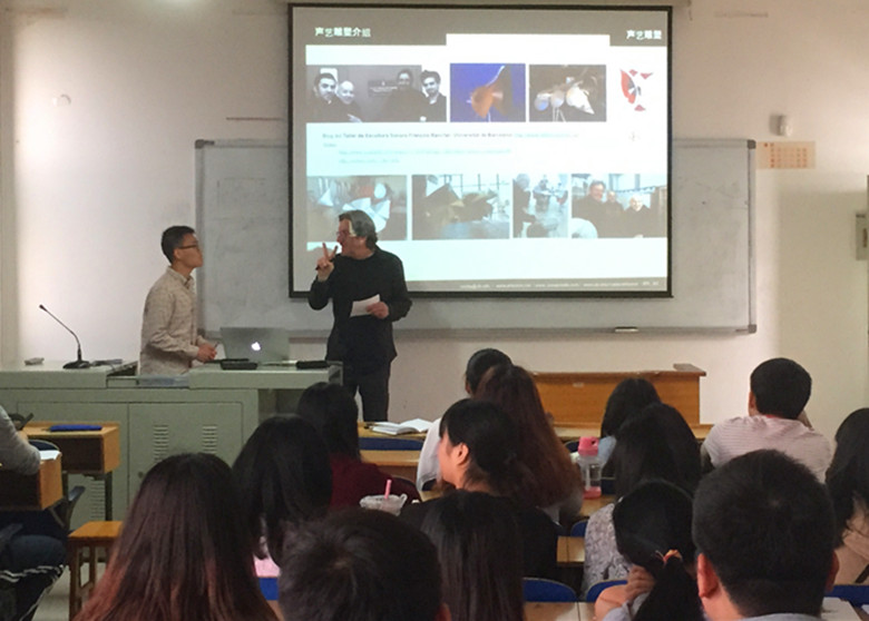 Josep教授从国外“声音雕塑”的出现、发展入手,讲述了“声音雕塑”的发声方式、发声材料和“声音雕塑”在公共艺术中的应用,课堂上,Josep教授还带领同学进行了声音雕塑的表演练习。