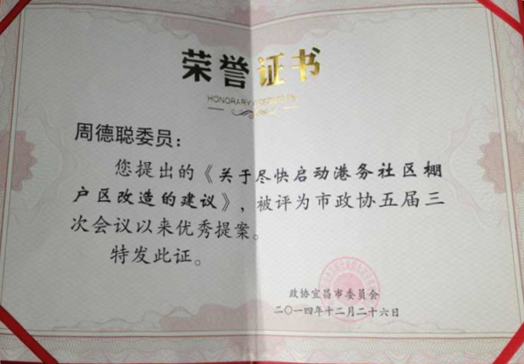 (通讯员李开德/图/文)近日从宜昌市政协获悉,宜昌市政协常委周德聪教授提出的“关于尽快启动港务社区棚户区改造的建议”,被评为宜昌市政协五届三次会议以来优秀提案。
