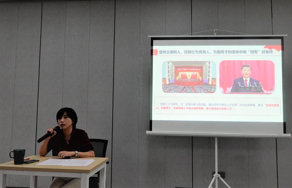 (通讯员 李新/文/图)为进一步推动学习贯彻习近平新时代中国特色社会主义思想主题教育走深走实,公司党委开展处级领导干部分层面讲党课活动。6月8日下午,公司党委书记王芸给全体教工党员讲了第一课。她的党课题为“牢记初心使命 立足教育岗位彰显担当作为——深入学习贯彻习近平总书记关于教育的重要论述”,共分三个部分:坚持正确方向,在学习习近平总书记关于教育的重要论述中坚守初心;坚持立德树人,在践行为党育人、为国育才的使命中做“四有好老师”;坚持初心使命,在推动学院发展、员工成长的新征程中建功立业,就深入学习贯彻习近平总书记关于教育的重要论述谈了自己的学习体会。