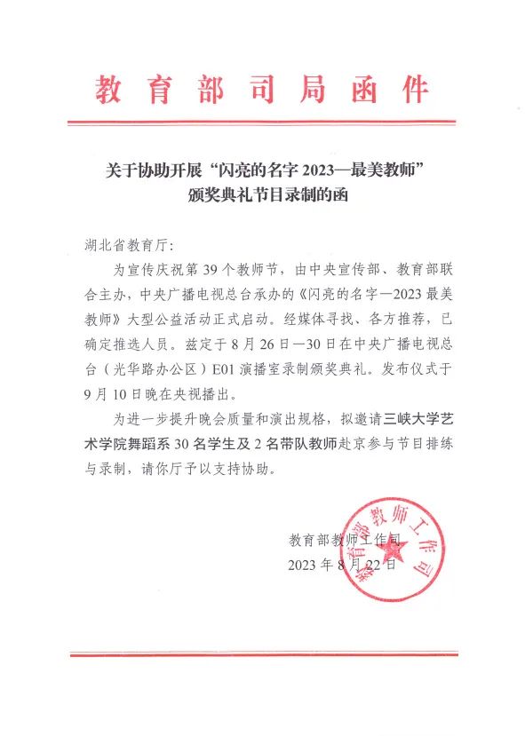 (通讯员 吕芳/文/图)致敬师者,勿忘师恩,昨日晚8点黄金档,由中央宣传部、教育部主办中央电视台承办的《闪亮的名字—最美教师发布仪式》在CCTV-1综合频道、CCTV-10科教频道学习强国、央视频、央视网等国家级媒体平台隆重播出。中宣部副部长、文化和旅游部书记、部长胡和平 教育部党组书记、部长怀进鹏出席了颁奖仪式。