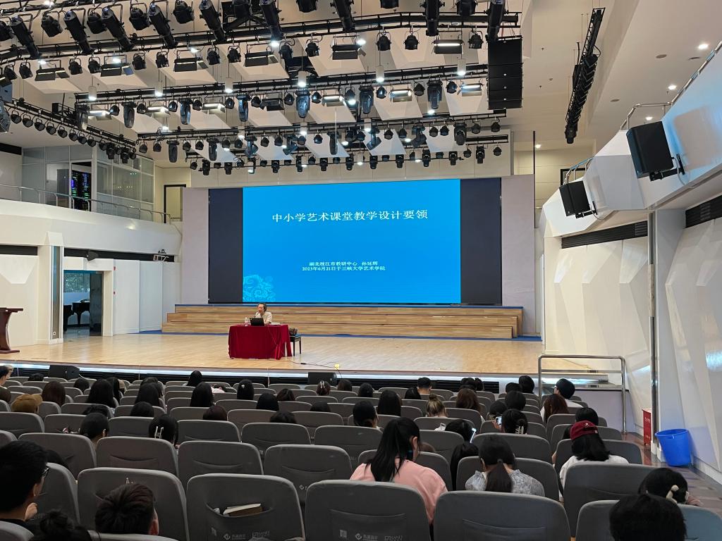 孙延辉老师的讲座专业细致,内容与中小学艺术课堂密切联系,强调教师进课堂要做到“有备而来,有备而教”,中小学艺术学科教育的最主要方式是“体验实践,互动探究”,孙老师从学法、教法等方面,对在场聆听讲座的师生们进行了深入讲解。