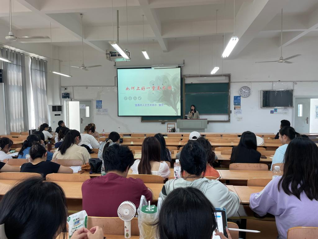 当天下午由宜昌市人文艺术高中高级教师曾芳,进行了“如何上好一堂美术课”的讲座,为同学们介绍了中小学美术课程的开展和美术课程教学中的设计思路。