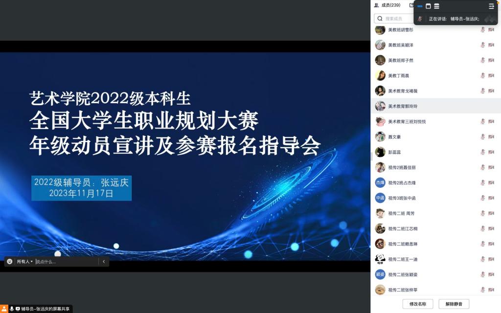 (通讯员 张远庆/文/图)11月18日上午,关于2022级本科生年级大会暨全国老员工职业规划大赛年级动员通过腾讯会议线上组织召开。本次大会主要进行了“诚信应考”主题教育和职业规划大赛的动员指导。